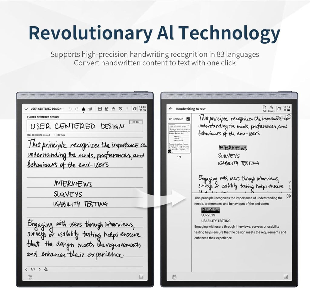 - AI Handwriting Recognition: instantly converts your handwritten notes into editable digital text. It supports recognition for 83 languages, making your notes fully searchable.