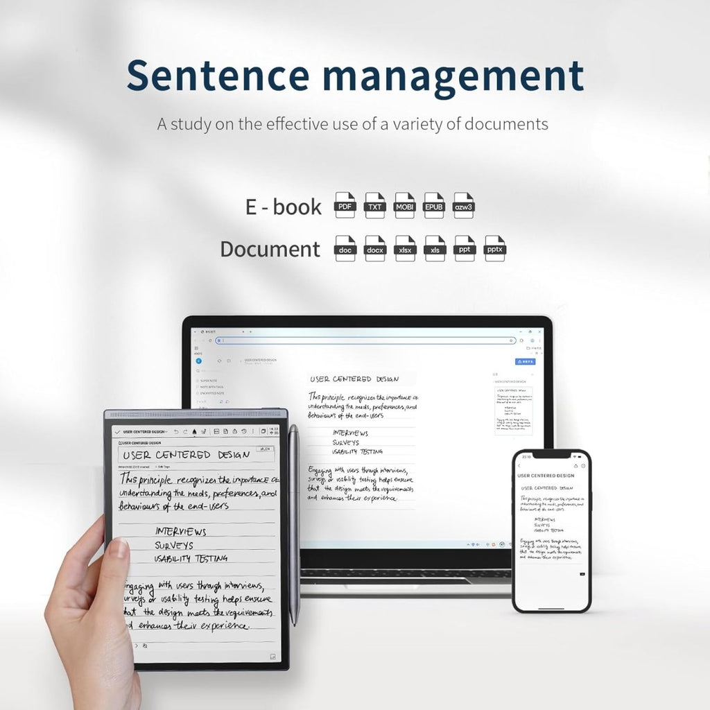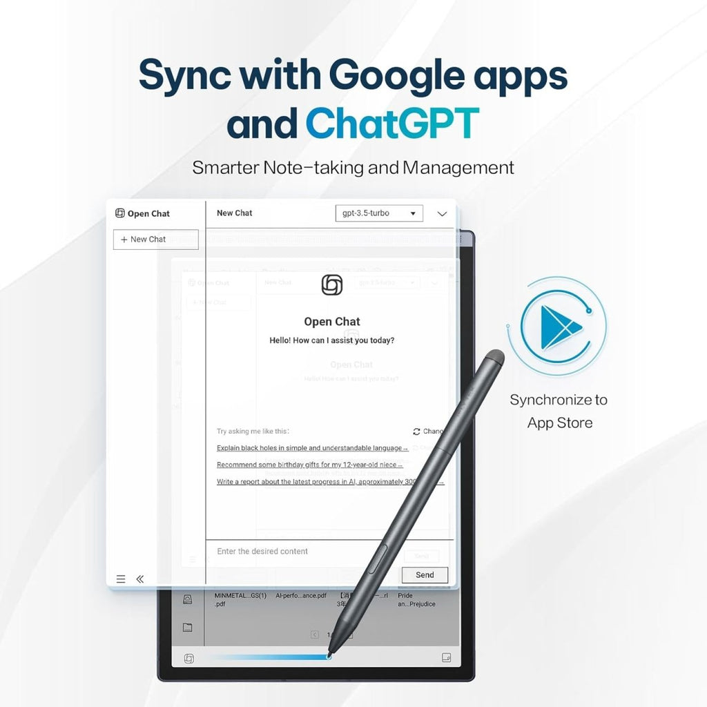The AINOTE Air 2 supports a vast array of document formats, including PDF, EPUB, TXT, MOBI, PPT, and DOCX. It seamlessly integrates with cloud services, allowing you to sync your notes and recordings across multiple platforms via the dedicated mobile app. Wi-Fi 6 and Bluetooth 5.0 ensure fast data transfer and connection to wireless headphones for listening to audio playbacks or text-to-speech readings.