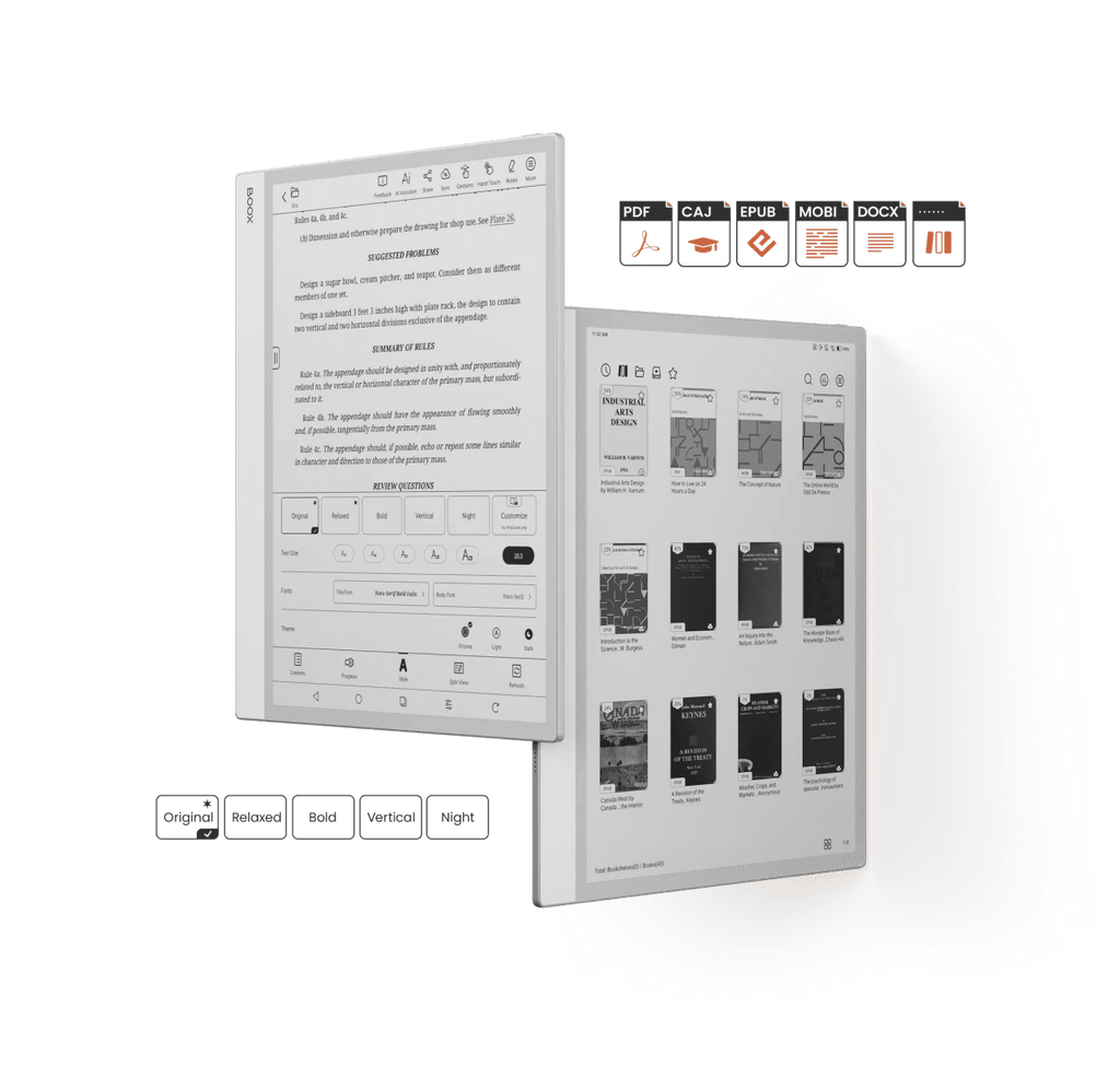 L’interfaccia è pensata per la produttività su schermo ampio. Il firmware BOOX facilita la gestione dei file e la sincronizzazione fluida. Puoi trasferire documenti senza fili tramite BOOXDrop o utilizzare la porta USB-C. Il dispositivo supporta numerosi formati (PDF, DJVU, EPUB, DOCX, PPTX) fin da subito, con potenti strumenti di annotazione disponibili per tutti.